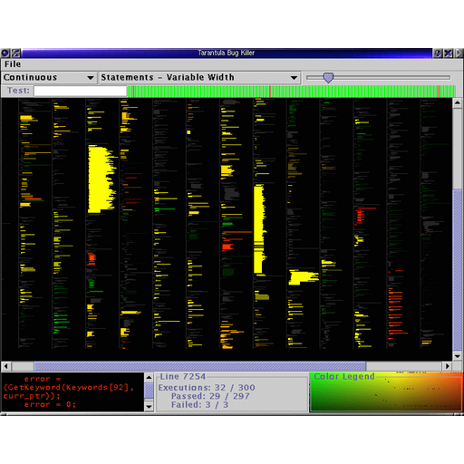 We developed a fault-localization technique that utilized correlation-based heuristics. The technique and tool was called Tarantula. Tarantula uses the pass/fail statuses of test cases and the events that occurred during execution of each test case to offer the developer recommendations of what may be the faults that are causing test-case failures. The intuition of the approach is to find correlations between execution events and test-case outcomes — those events that correlate most highly with failure are suggested as places to begin investigation. These event correlations may not be causative of the failures, but they offer hints to reduce the search space of the fault. Execution event types that have been evaluated include statement execution, branch execution, data-flows, dynamic invariants, and performance profiles.